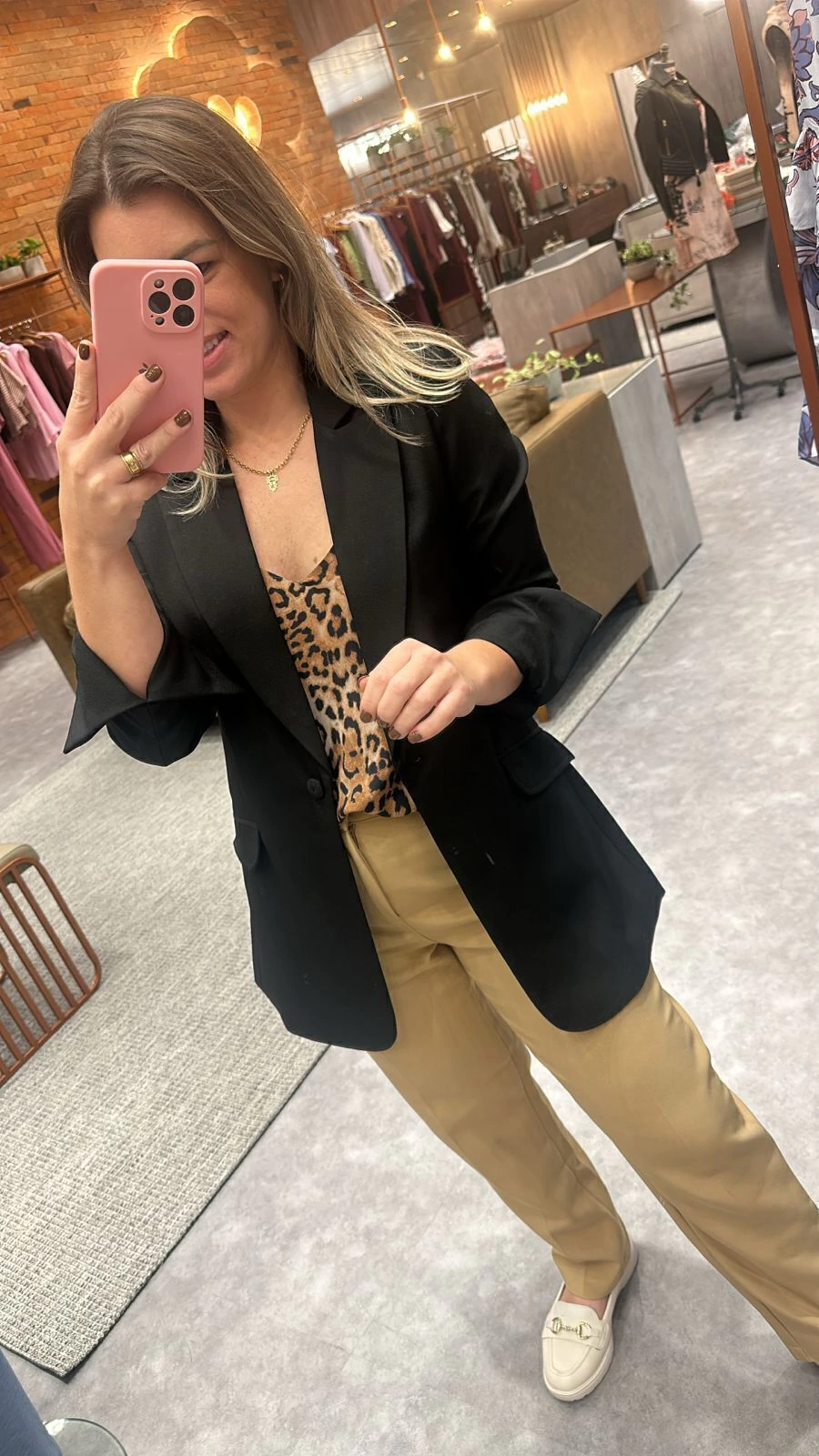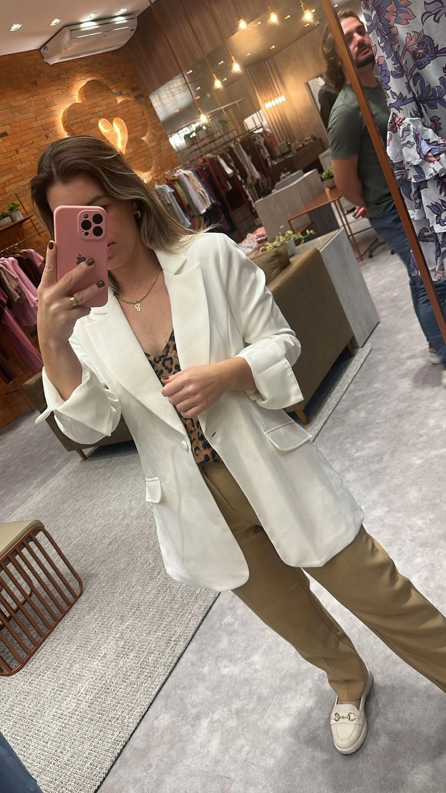 Sua modelagem levemente alongada e o corte todo estruturado conferem uma silhueta refinada e impecavel, enquanto o tecido fluido garante movimento e leveza ao vestir.
